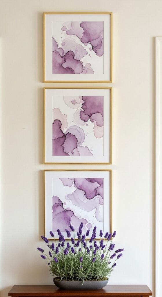 Affordable art sets the tone without permanent changes. Lavender prints add color while staying sophisticated.