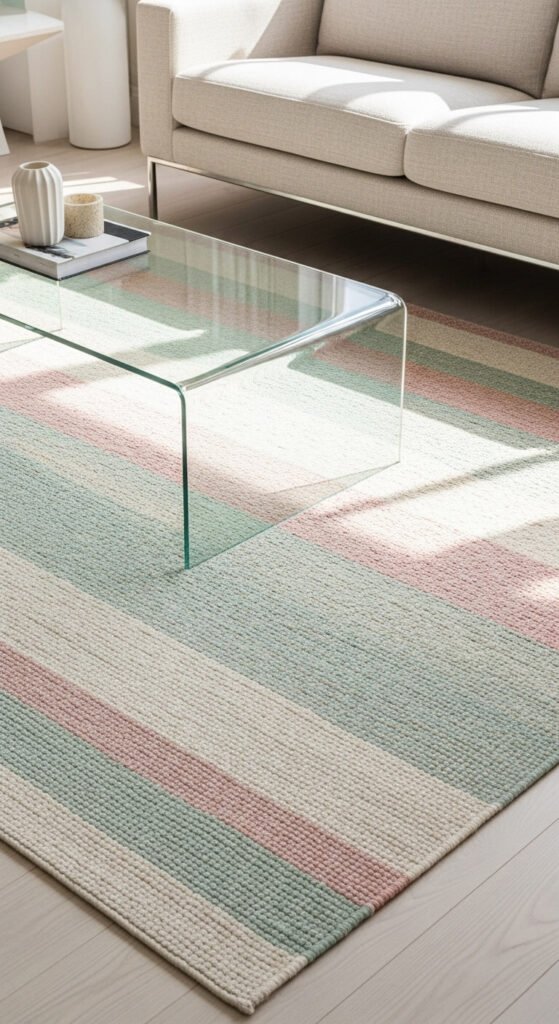 Rugs anchor spaces and define zones in open floor plans. Striped patterns in pastels feel playful without being childish.