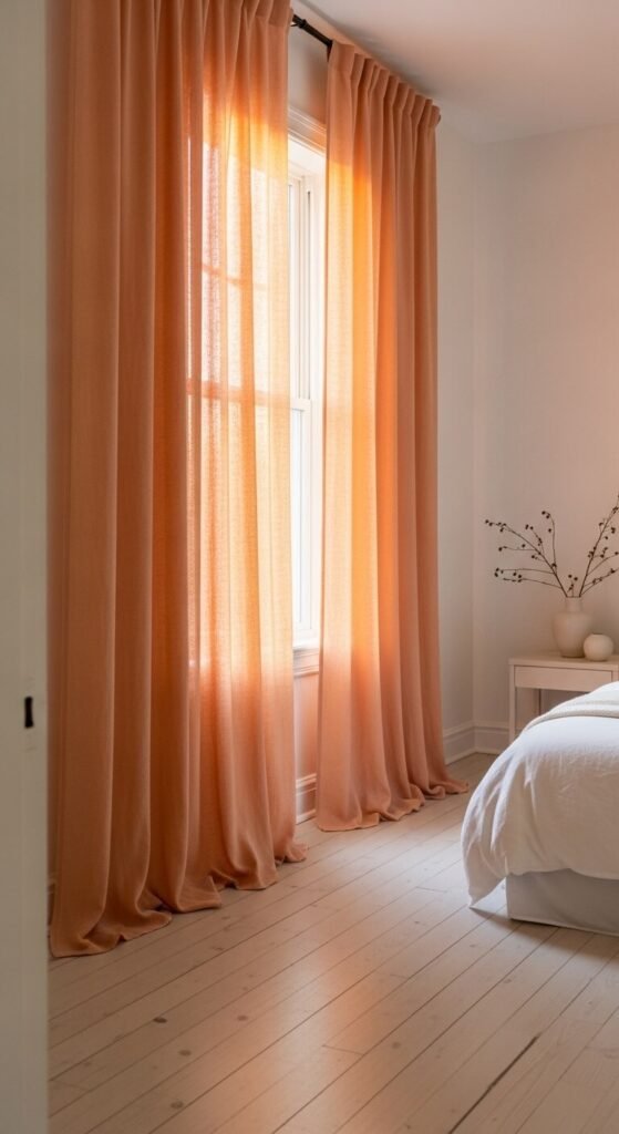 Curtains soften windows and control light better than blinds alone. Peach linen adds warmth without heavy color saturation.