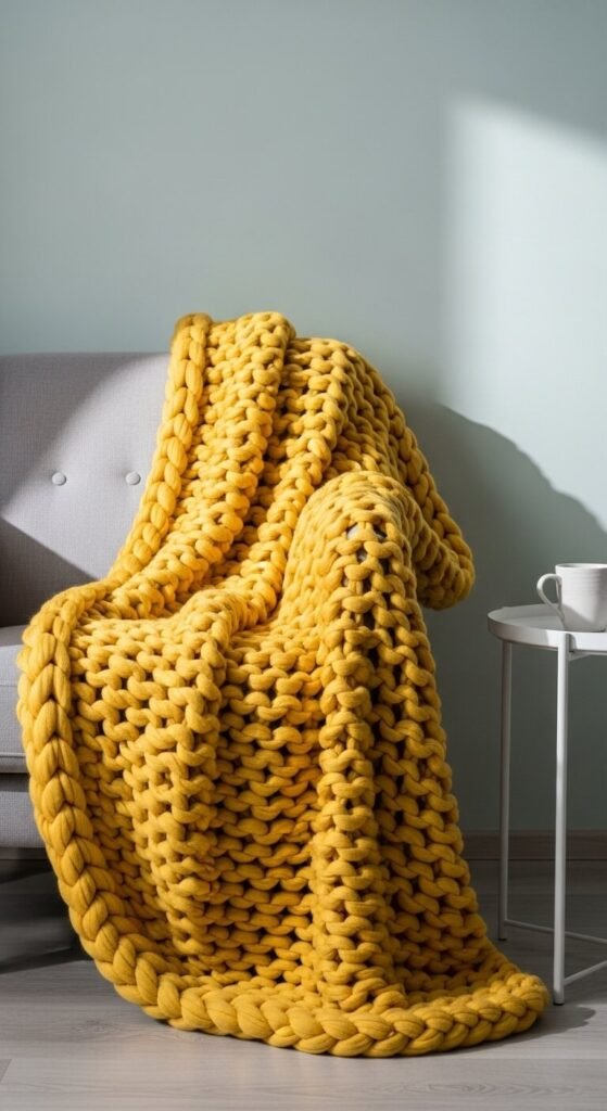 Yellow works surprisingly well with both warm and cool color schemes. The soft butter tone avoids the harshness of bright yellow. Keep it accessible—blankets that get used look better than perfectly staged ones.