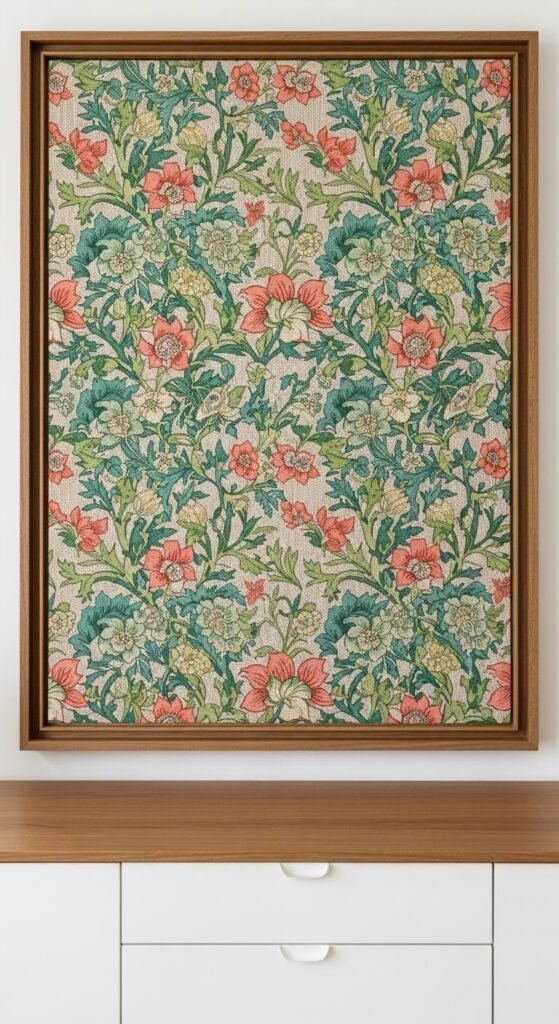 Choose patterns with botanical motifs—florals, leaves, or garden scenes. The fabric adds softness that paper prints can’t match. Frame or leave unframed for casual appeal.