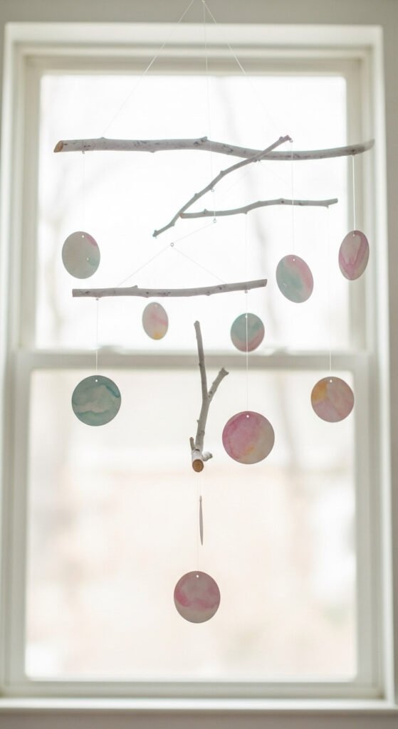 Collect straight twigs during spring walks and suspend them using fishing line to create a hanging mobile. Add painted wooden beads or watercolor circles in spring shades.