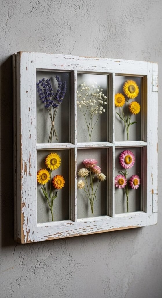 Tuck dried flowers into each pane section—lavender, statice, and strawflowers all dry beautifully. Secure stems with thin floral wire wrapped around the grid.