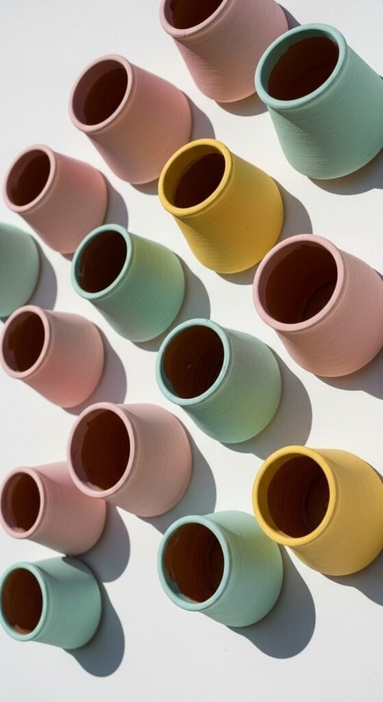 Arrange in geometric patterns—hexagons work well. Each 3-inch pot costs under $1. Leave some unpainted for texture contrast.
