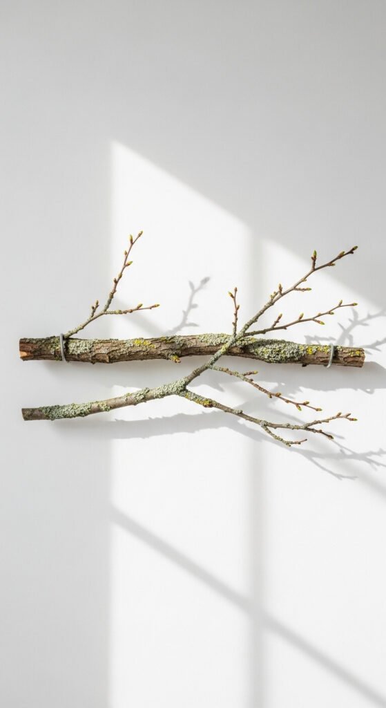 Mount actual branches directly to walls using picture hanging strips. Collect branches with interesting curves or multiple smaller offshoots.