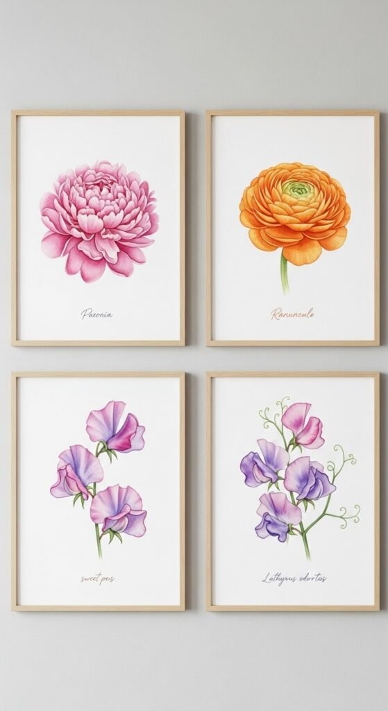 Choose one flower per print rather than crowded bouquets. The simplicity feels sophisticated. This works in any room but especially shines in bathrooms, bedrooms, or reading nooks where calm, pretty imagery creates peaceful environments.