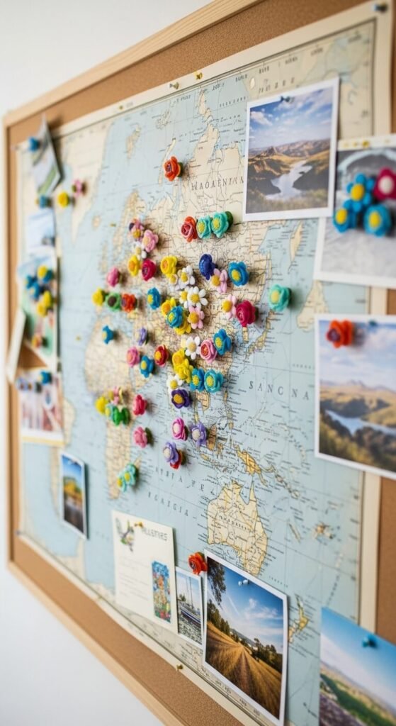 Cover a cork board with decorative map paper, then create custom pushpins by gluing small artificial flowers to pin tops. Mark places you’ve been or dream locations.