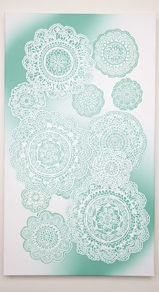 Lay paper doilies on canvas and spray paint over them in spring colors. When you remove the doilies, intricate patterns remain.