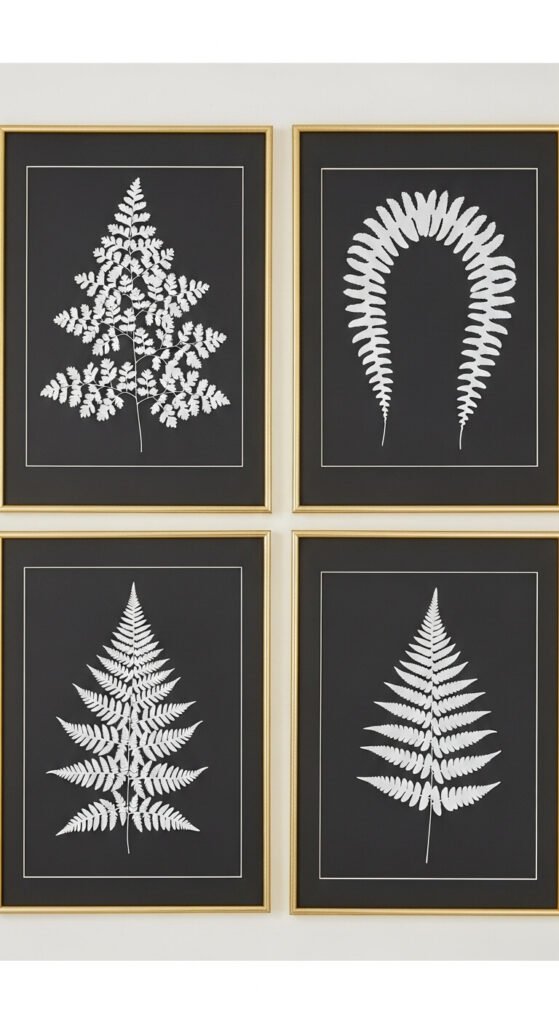 Print white fern silhouettes on dark cardstock (navy or charcoal) for dramatic contrast. Frame in matching gold or brass frames from HomeGoods.
