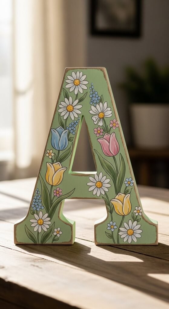 Paint a large wooden letter (your initial or family monogram) in a spring shade, then add tiny painted flowers around edges. Wooden letters cost $8-15 at craft stores.