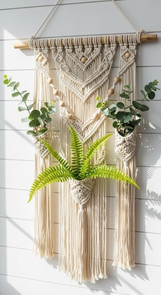 Buy a basic macrame hanging from World Market (around $25) and personalize it by tucking real greenery into the woven pockets.