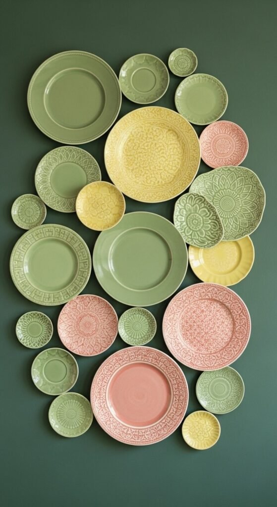 Use plate hangers (four-pack for $8 on Amazon) to mount them. Arrange on the floor first to plan your composition—mix sizes and overlap slightly for visual interest.