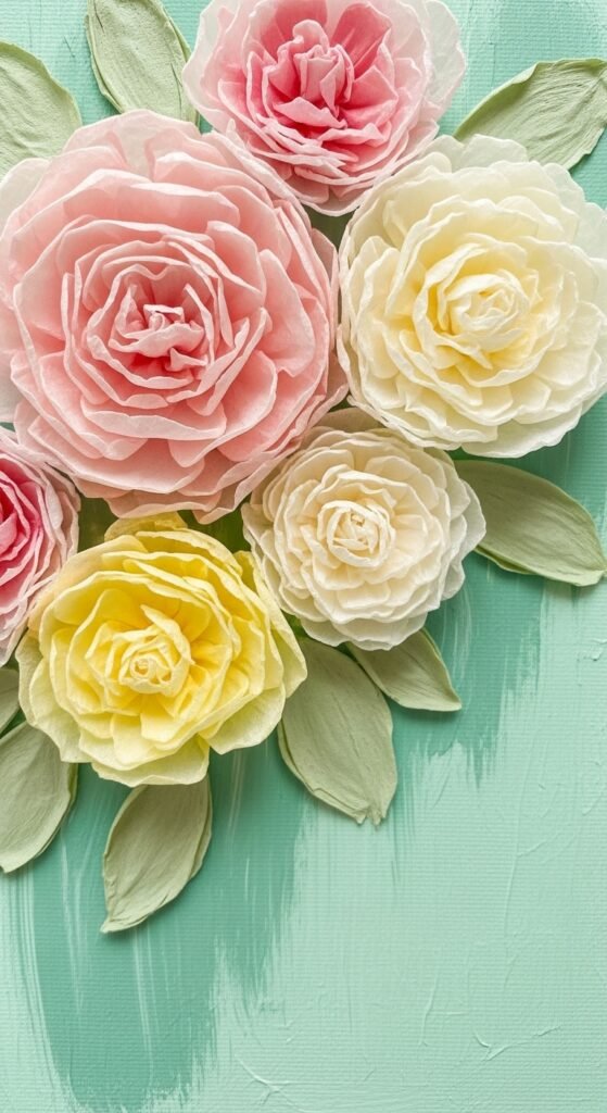 Paint your canvas background in a spring shade first. Let dry, then attach your flowers using a glue gun. Scrunch the tissue slightly before attaching for realistic petal texture.