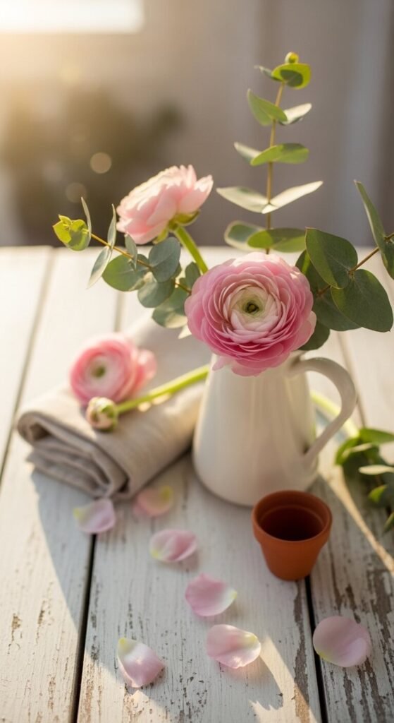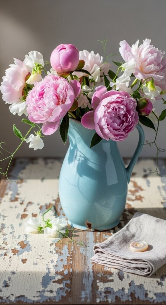Pitchers are underrated vases. Pull out any pastel or vintage-looking pitcher you already own. Fill it loosely with peonies, sweet peas, or even grocery store carnations dyed with food coloring overnight. Set it beside a folded cloth napkin and one small found object — a button, a coin, a smooth shell. The trick is odd numbers and height variation. Keep it casual. An over-arranged vignette loses its charm. Let the flowers spill naturally over the rim.