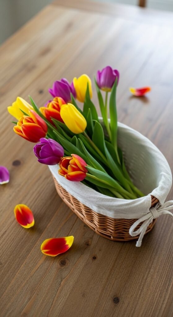 Wicker baskets are thrift store staples. Line one with a tea towel or cloth napkin and drop in a whole grocery store bunch of tulips — stems cut short. Set it on a dining table or kitchen island. The contrast of the rough basket against soft petals is the story. Tulips are among the most affordable flowers available in spring — often $4–$6 for ten stems. Change the cloth underneath each week to shift the mood from country to minimalist. One basket, endless arrangements.