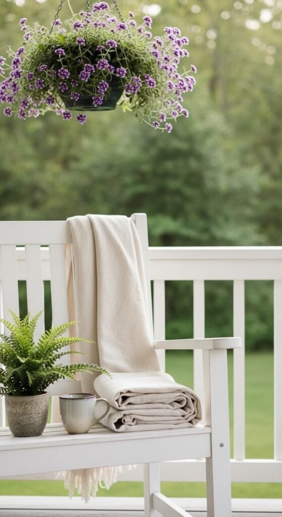 A porch swing is a natural storyteller. Add one folded throw, a potted plant, and a mug on the seat and you have a vignette that says “someone was just here.” That lived-in quality is exactly what makes it feel warm and real. Hang a trailing plant basket above to frame the whole scene. Ferns and verbena both do well in hanging baskets for under $8 at a garden center. The throw can be any neutral blanket you already own. Zero new purchases required.