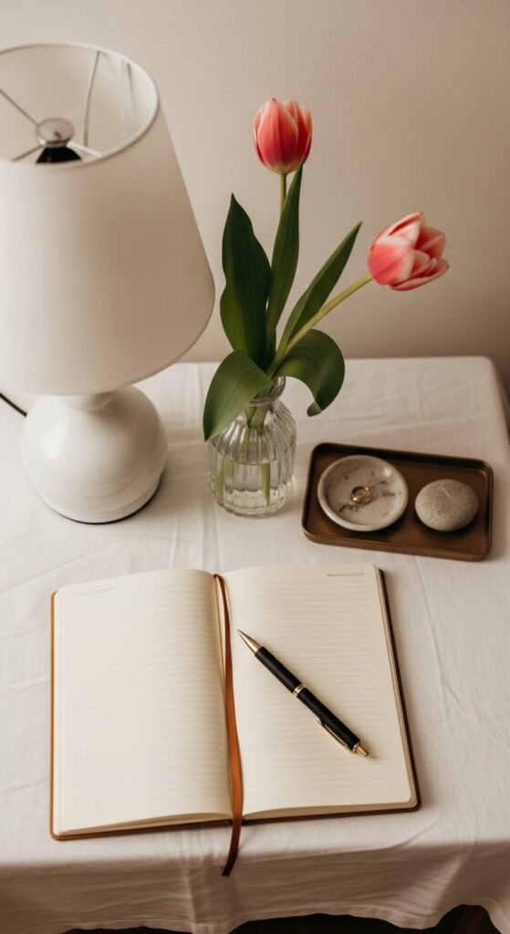 A bedside vignette is personal. Swap out any heavy winter objects for lighter, airier spring ones. A small bud vase with two tulips. An open journal. A smooth stone or shell from a walk. Keep the color palette soft — whites, blush, sage. This isn’t about filling space. It’s about choosing three to five things that feel intentional. A single fresh stem in a shot glass counts. The goal is to wake up to something beautiful. That matters more than anyone gives it credit for.