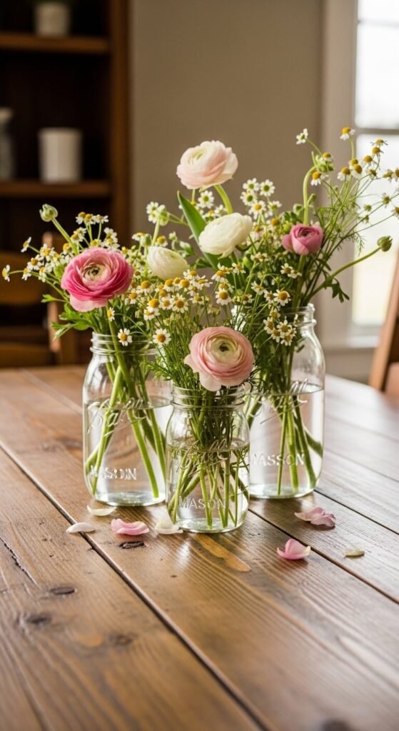 Three mason jars grouped together create more visual impact than one large vase. Use different jar sizes — a pint, a half-pint, and a jelly jar. Fill each one with different flowers or color groups from the same grocery bunch. Cluster them tightly together on the table. Add a few fallen petals around the base intentionally. This is a dinner party centerpiece that costs $8 total. Mason jars are stackable, reusable, and always available. The casual quality of the arrangement is the whole point.