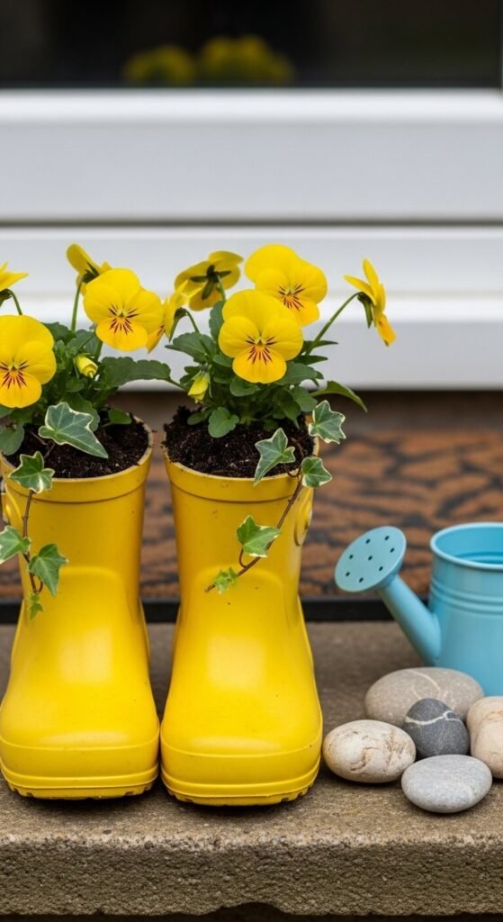 Plant flowers directly into a child’s old rain boot. Drill a small drainage hole in the sole and fill with potting soil. Pansies and violas are perfect — they’re cold-hardy, affordable (under $2 per plant), and colorful. Set the boot beside a door or on a step alongside a small watering can. This vignette tells a story of childhood and spring together. It makes people smile every single time they see it. It’s also a great activity to do with kids on a slow weekend afternoon.