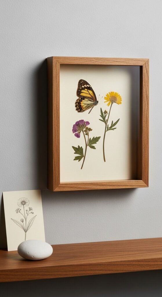 Frame pressed flowers alongside a butterfly print or a nature illustration. This creates a vignette that feels like a naturalist’s collection. Press flowers between two heavy books for two weeks — no equipment needed. Print a free butterfly illustration from a public domain archive. Frame both together in one frame or side by side. Hang it low on a wall and set a small shelf piece below. This type of vignette has a story about the natural world. It makes a blank wall feel intentional and thoughtful.