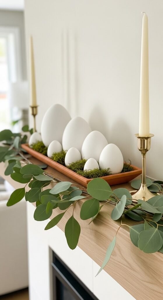 A spring mantel doesn’t need to look like a holiday display. Keep it understated. A row of white ceramic eggs in a small tray. Two taper candles in mismatched holders. A few stems of eucalyptus laid across the ledge. Moss balls from the craft store add texture for under $3 each. The horizontal line of the mantel gives you natural structure. Work in threes and vary height. Everything should feel like it belongs in the same quiet story — not like it came from a holiday aisle.
