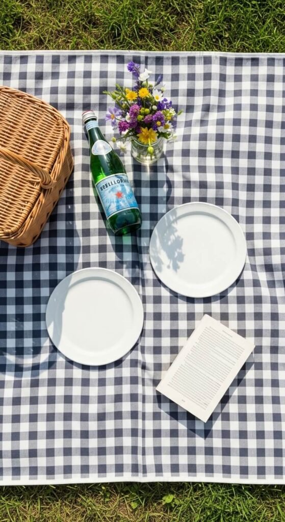 Lay a blanket, add a basket, and let the scene speak. A picnic vignette is the easiest outdoor arrangement you can create. It photographs beautifully from above. Use a gingham or striped blanket, a wicker basket, a small jar of wildflowers, and two plates. You don’t even need food in the shot. The suggestion of a meal, a book, and company is enough. This kind of vignette works for styled photos, garden parties, or just a slow Sunday morning in the yard. The story writes itself.