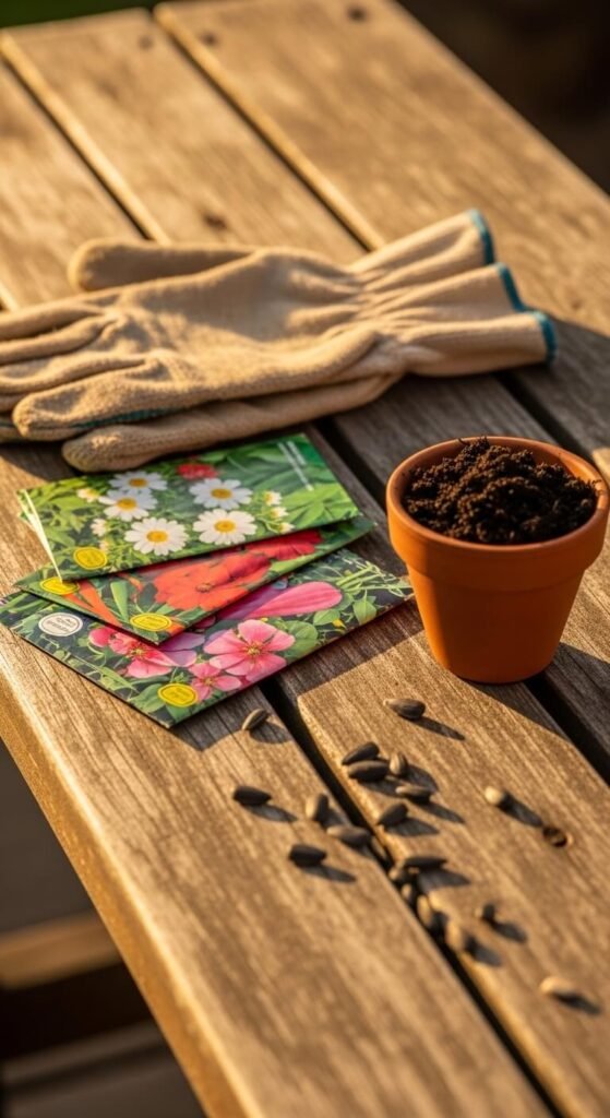 Fan three seed packets across a potting bench or a kitchen counter beside a pair of worn gardening gloves. Add a small trowel and one pot of fresh soil. This vignette is about anticipation — the feeling right before something grows. Seed packets cost under $2 each. Gardening gloves from a dollar store work perfectly for the visual. The charm is in the realness of it. Worn tools and dirty gloves tell a more honest spring story than anything pristine ever could.