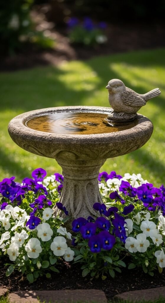 Plant low-growing flowers around the base of a bird bath to frame it like a painting. Violas and alyssum are inexpensive, low-maintenance, and bloom all season. Add one small garden figurine — a stone bird, a frog, or a bee — to give the scene personality. Keep it asymmetrical. A perfectly symmetrical garden vignette loses its natural quality. The best garden arrangements look like they happened on their own. Nudge things into place, then leave them alone to settle in.
