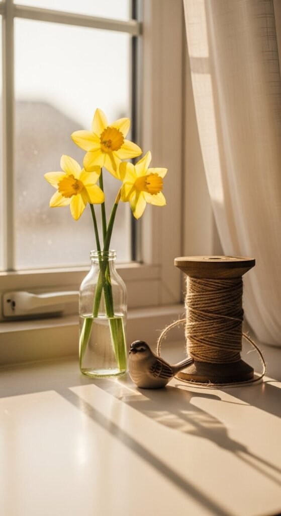 A windowsill is free real estate. Most people leave it bare. A single glass bottle with two or three daffodils changes the entire energy of a room. Add a small ceramic figurine or a smooth stone. That’s it. The light does the rest. Morning sun will hit the water in the bottle and throw tiny rainbows across the wall. This kind of vignette costs almost nothing. Grab flowers from a grocery store bunch for under $5 and reuse a vinegar bottle.