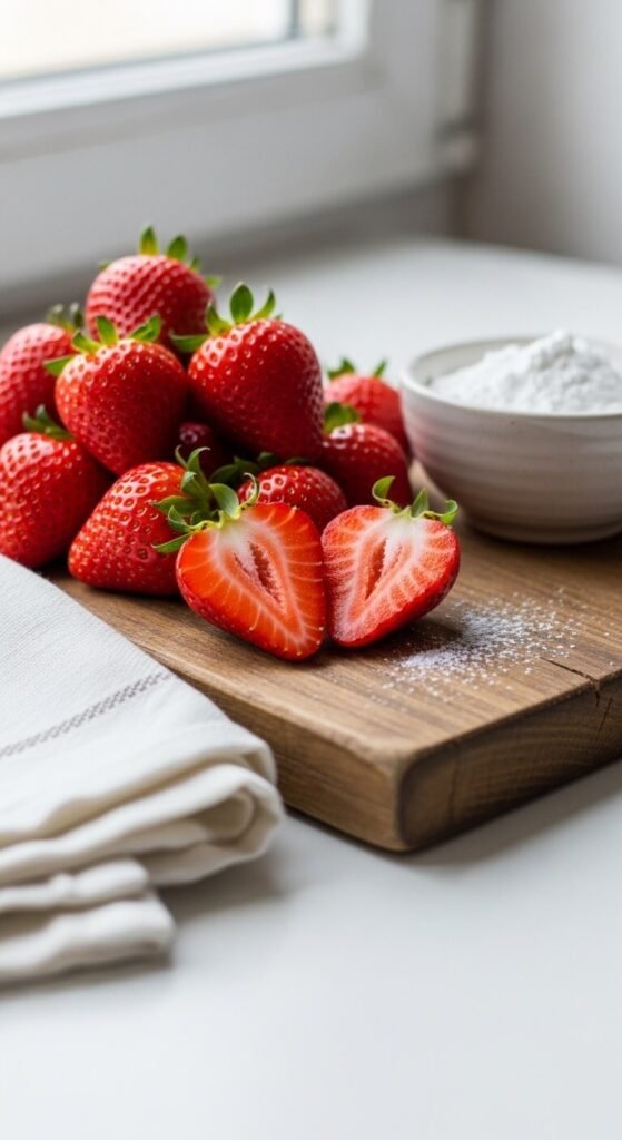 A cutting board vignette is the fastest food styling trick in the book. Place fresh strawberries — whole, halved, and a few leaves attached — on a worn wooden board. Add a folded linen napkin and a small bowl of something white (sugar, yogurt, cream). That’s your vignette. It tells the story of a slow spring morning. Strawberries cost $3–$4 a pint. The linen napkin you already own. This kind of arrangement makes any kitchen counter look intentional without a single tool or special skill.