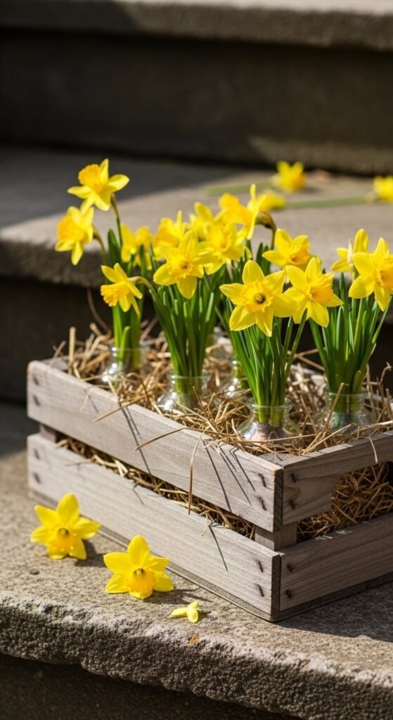 Line a wooden crate with straw or moss and tuck in small glass bottles or jars, each holding a few daffodil stems. The crate keeps everything contained while looking completely casual. Set it on a front step, a garden wall, or a porch railing. Daffodils are one of the most affordable spring flowers — often sold in bunches of ten for $4. The glass bottles give each stem room to shine. This arrangement also dries beautifully, so you can extend its life by letting the daffodils dry in place.