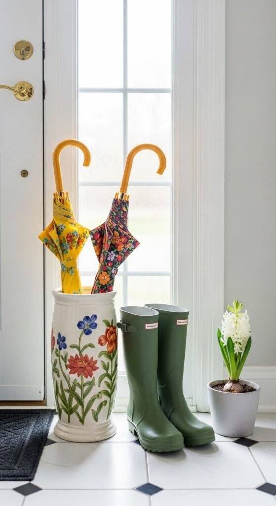 An entryway vignette that includes rain gear celebrates spring weather instead of apologizing for it. Place a ceramic umbrella stand — thrifted for a few dollars — beside your door. Add two mismatched colorful umbrellas and a pair of boots. Place a small potted hyacinth on the other side for fragrance and color. This vignette works in any entryway, large or small. It tells visitors that this home is lived in and loved. The color contrast between the boots and the white hyacinth does a lot of visual work.