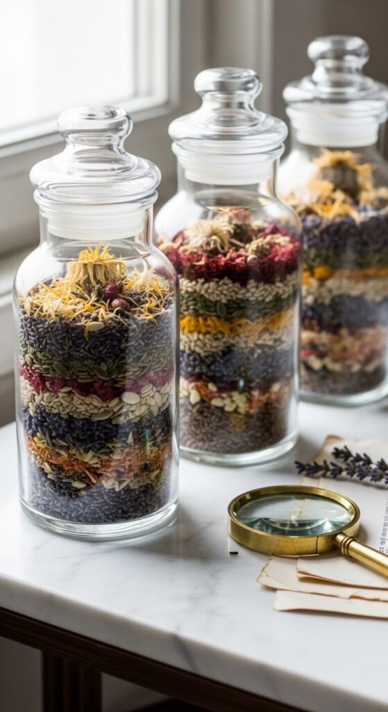 Fill apothecary jars with dried botanicals — lavender, dried chamomile, poppy seed heads, or pressed petals. Layer them like a terrarium. Seal with a cork lid. These jars look beautiful grouped in threes on a bathroom shelf, a kitchen counter, or a mantel. They last indefinitely and require zero upkeep. Dollar stores sometimes carry similar jars. Gather the botanicals from your own yard or dried grocery store bunches. The layers create visual depth, and the whole arrangement tells a story about collecting and curiosity.