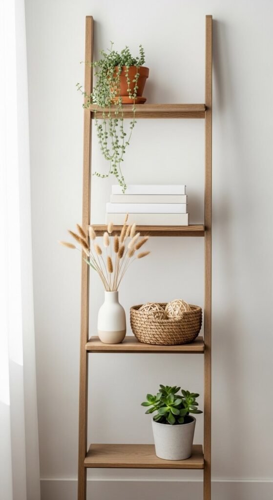 A leaning ladder shelf gives you five or six levels to work with — and each one can tell a slightly different spring story. Alternate between plants, books, ceramics, and baskets. Don’t fill every shelf. Leave one or two empty or nearly empty. The visual breathing room makes the whole thing feel styled rather than cluttered. Mix heights and textures at each level. A trailing plant at the top level adds movement. The whole shelf arrangement can be updated season by season by simply swapping the plants and adding new stems.