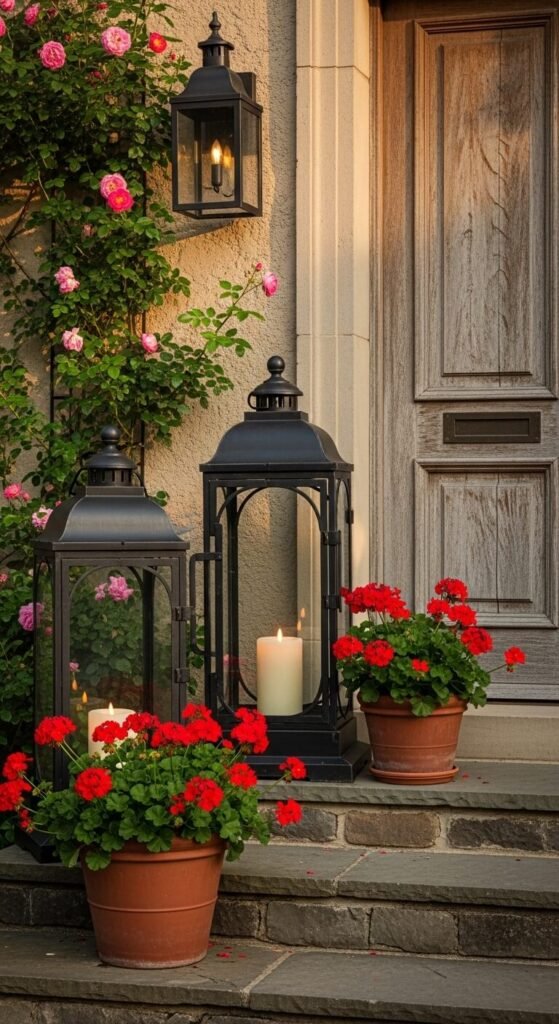 Flank a front door with two matching lanterns — one on each side — and place a potted plant at the base of each. Geraniums are classic, affordable, and bloom from spring through summer. Tall lanterns can be found at thrift stores or discount home stores for under $10 each. This symmetrical vignette gives any front door a sense of intention and welcome. It doesn’t take long to set up and immediately changes how a home reads from the street. Add a candle inside each lantern for evening warmth.