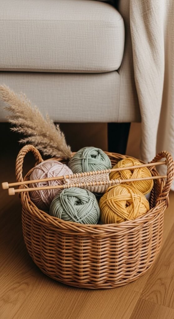A knitting basket styled with spring yarn colors creates a vignette that is both functional and beautiful. Swap out your winter dark-toned yarn for pastel rolls in blush, sage, and butter yellow. Rest the needles across the top. Lean a single tall dried stem — pampas grass or a dried allium — against the basket for height. This kind of vignette works beside an armchair, a reading nook, or at the end of a sofa. It tells the story of someone who creates things with their hands. That story is always worth telling.