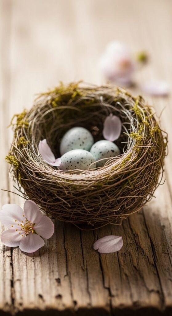 Found nests are nature’s gift to decorators. Place a nest on a small wooden board or a cake stand and tuck in a few ceramic or dyed eggs. Surround the base with scattered petals or moss from the craft store. This vignette works on a dining table, a mantel, or a bathroom shelf. Faux eggs cost $2–$3 at most craft stores. Real nests can be gathered from fallen branches after winter. It’s one of the most story-rich arrangements you can make.