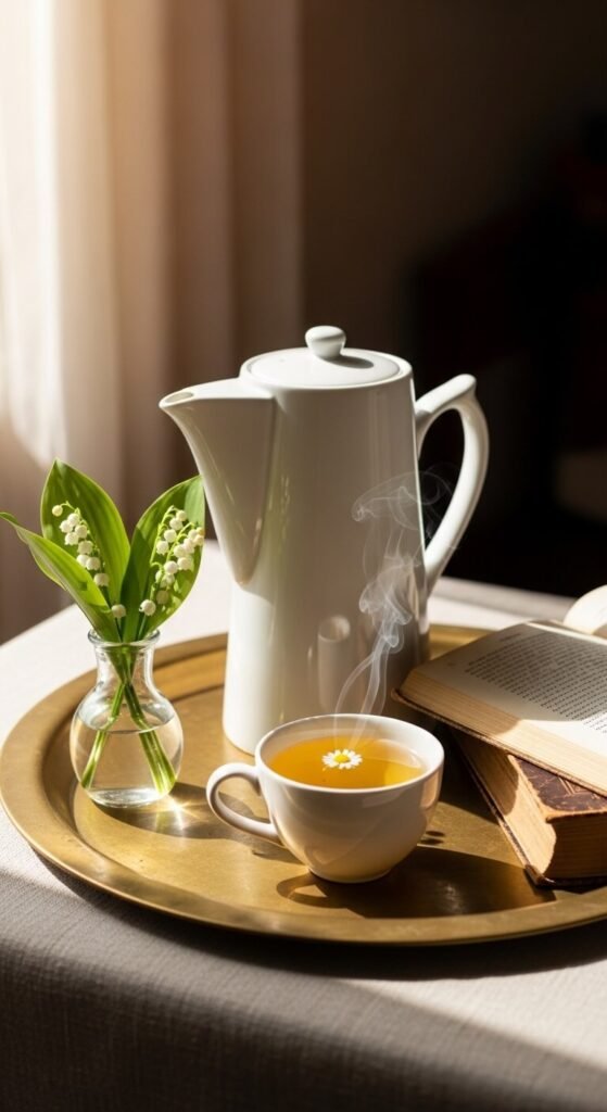 A tray instantly organizes a vignette. It gives everything a home. Find any thrifted tray — brass, wood, or rattan — and fill it with items that tell a slow morning story. A teacup, a small stack of books, and a bud vase with a single stem. This works on a coffee table, a nightstand, or a console. Thrift stores regularly stock trays for $1–$3. The items inside don’t all need to match. Texture contrast — metal + linen + ceramic — is what makes it interesting.