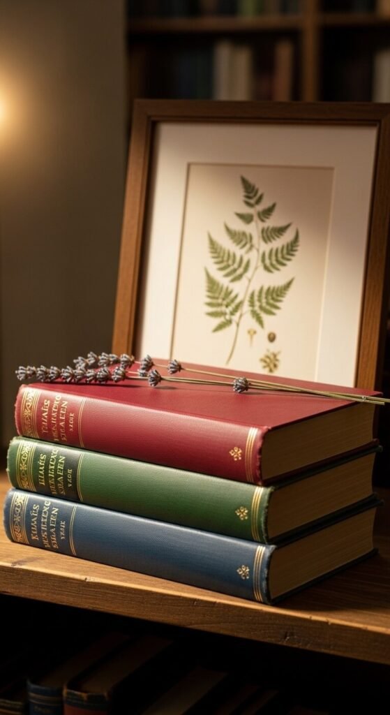 Lean a framed botanical print against the wall behind two or three stacked books. Rest a dried lavender stem or a pressed leaf across the top. This is a literary spring vignette — it whispers of garden journals and slow afternoons. Free botanical prints are available on public domain sites like the USDA or Smithsonian archives. Print one at home for under $1. Frame it in anything — a dollar store frame works perfectly. The layering of objects at different heights is what gives this depth.