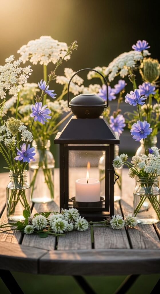 Take an old lantern — any style — and surround it with small jars of wildflowers. Pick wildflowers from a field or roadside where it’s permitted. Queen Anne’s lace, clover, and chicory are free and gorgeous. Vary the jar heights. Place the whole grouping on a wooden board or tray to anchor it. This works beautifully on a porch, a garden table, or an outdoor dining setup. Lit from within at dusk, it becomes something truly atmospheric. The whole setup can cost under $5.