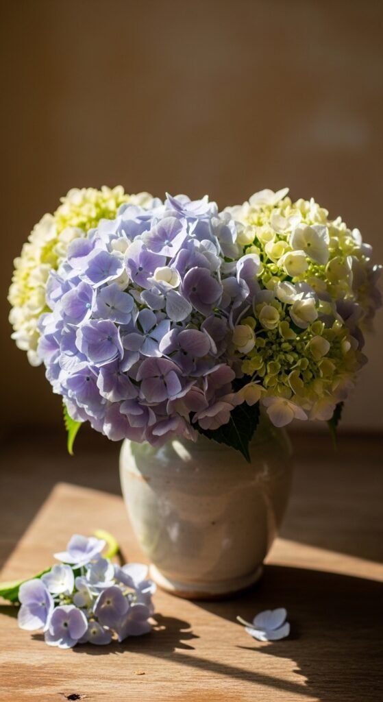 Plan your hydrangea displays around seasonal colors to keep your home feeling current all year. Spring and summer call for blush, lavender, and sky blue. Fall is the perfect time for rust, burgundy, and antique cream. Winter works beautifully with white, silver-touched stems, and dried neutral tones. Matching your arrangement to the season makes a simple display feel intentional and styled. Many florists discount hydrangeas at the end of the week — ask at your local flower shop or market. Seasonal buying also means better quality at lower prices.