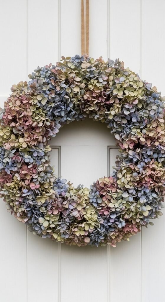 Dried hydrangeas last for months and require zero maintenance. Hang fresh stems upside-down in a cool, dark room for two to three weeks. The slower they dry, the better the color retention. Once dry, wire the blooms onto a plain grapevine wreath base from a craft store. Dusty blue, antique pink, and cream hydrangeas look especially beautiful dried. A finished DIY wreath like this costs around $15–$20 total and can last an entire season without wilting.