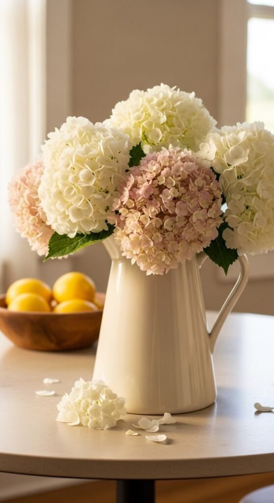 An old ceramic or enamel pitcher is one of the best vases for hydrangeas. The wide opening supports multiple heavy-headed stems without needing foam or frogs. Fill the pitcher with cold water and a few drops of lemon juice to slow bacteria growth. Trim the stems at an angle right before arranging. This look works especially well in a kitchen or breakfast nook. Check thrift stores for vintage pitchers — they often cost $3–$8 and look far more interesting than standard vases.