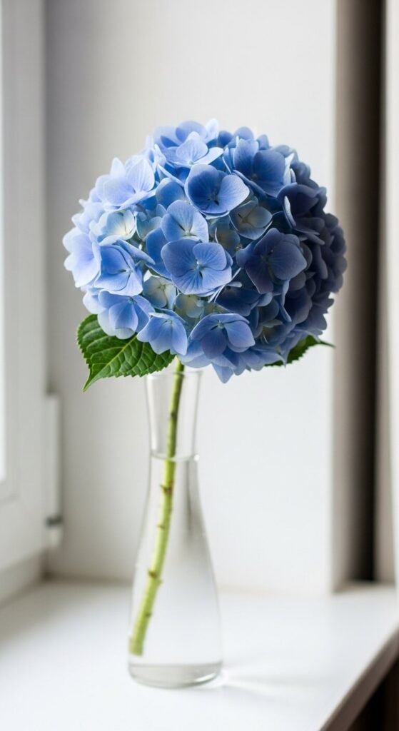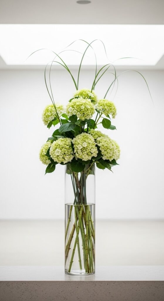Tall cylinder vases work well for hydrangeas when you want a more architectural look. Cut stems longer than you normally would — around 12 to 16 inches — so the blooms sit high above the vase rim. Add long decorative grass or willow branches to fill vertical space. The glass vase lets you see the stems, so keep the water clean and clear. Change it every other day and re-cut stems each time. This style suits modern or minimalist interiors perfectly.