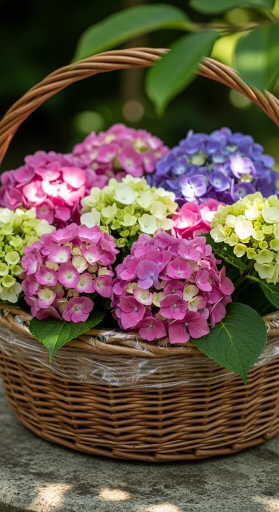 Line a wicker basket with a plastic bag or small pot, then fill it with water and hydrangea stems. This trick makes a lined basket look like a planted arrangement without the hassle or mess of soil. Use a mix of bloom colors for that loose garden-gathered feel. Place the basket on an outdoor table for a patio gathering, then bring it inside afterward. A basic wicker basket from a dollar store costs $1–$3 and instantly adds texture and warmth to any display.