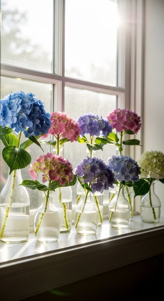 Line up a row of small bud vases along a windowsill, each holding one or two hydrangea stems. Vary the heights by cutting stems at different lengths. Use mismatched glass bottles, test tubes, or small jars for a collected, relaxed feel. This is a perfect way to use the last few stems from a dying bunch — trim them short and give them new life. The backlit window light makes hydrangea petals glow beautifully. Refill water daily since smaller vessels dry out fast.