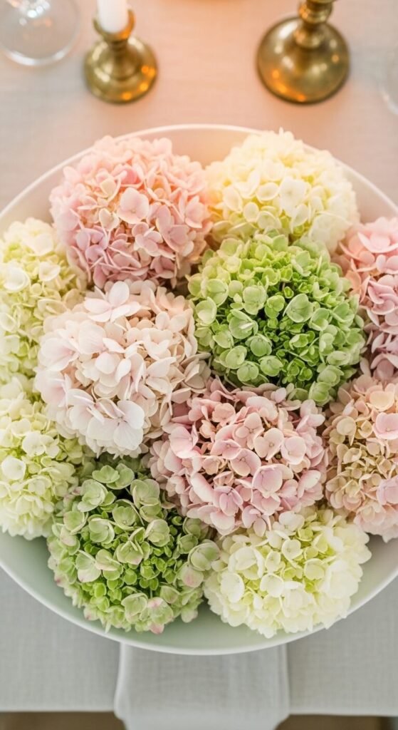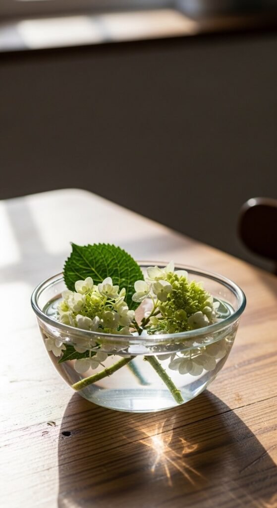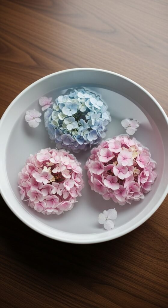 Cut hydrangea heads short — almost no stem — and float them in a wide, shallow bowl filled with water. This is one of the longest-lasting display methods because the petals absorb water directly. A ceramic salad bowl, a glass serving dish, or a vintage enamel pan all work well. Scatter a few loose petals around the floating blooms for a finished look. This style is perfect as a coffee table display or bathroom accent. Blooms can stay fresh this way for up to four or five days.