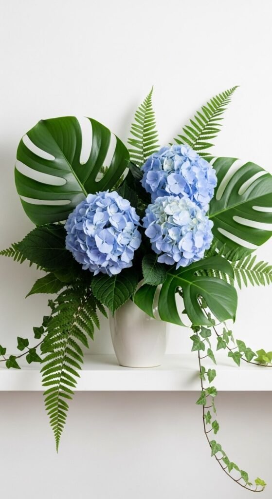 Strip back the extras and let hydrangeas shine against bold greenery alone. No filler flowers needed — just a few large leaves like monstera, magnolia, or ferns. Green foliage from your own yard or garden works perfectly here. The contrast between lush green and a large hydrangea bloom is visually striking and very easy to achieve. This approach is also budget-smart — the hydrangeas are the only purchase, and everything else comes from outside. Trim any submerged leaves below the waterline to prevent rot.