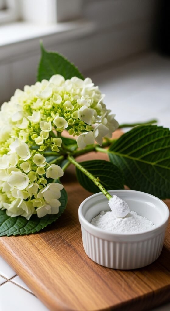 Before placing hydrangeas in water, dip the freshly cut stem end in alum powder — a common kitchen spice found in the baking aisle. Alum acts as an astringent that tightens the stem tissue and helps water travel upward more efficiently. Dip just the tip, then place the stem immediately in cool water. This simple prep step can add two to three extra days of vase life. A small jar of alum costs about $3 and lasts for dozens of arrangements. It’s one of the best-kept florist secrets.