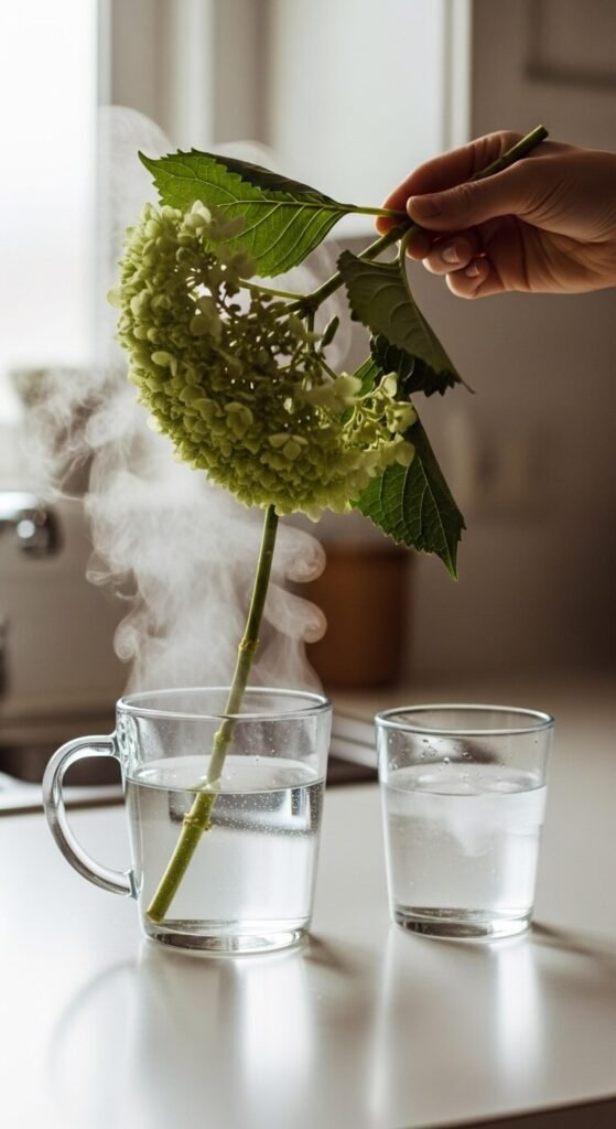 Hydrangeas have woody stems that can block water flow over time. Conditioning them with boiling water at the start helps seal the stem ends and forces air bubbles out. Cut stems at an angle, then hold them in boiling water for 30 seconds before placing them in a cool water vase. Do this each time you re-cut stems. It sounds counterintuitive, but the brief heat treatment actually opens the vascular tissue. Florists use this trick with nearly every woody-stemmed flower, not just hydrangeas.